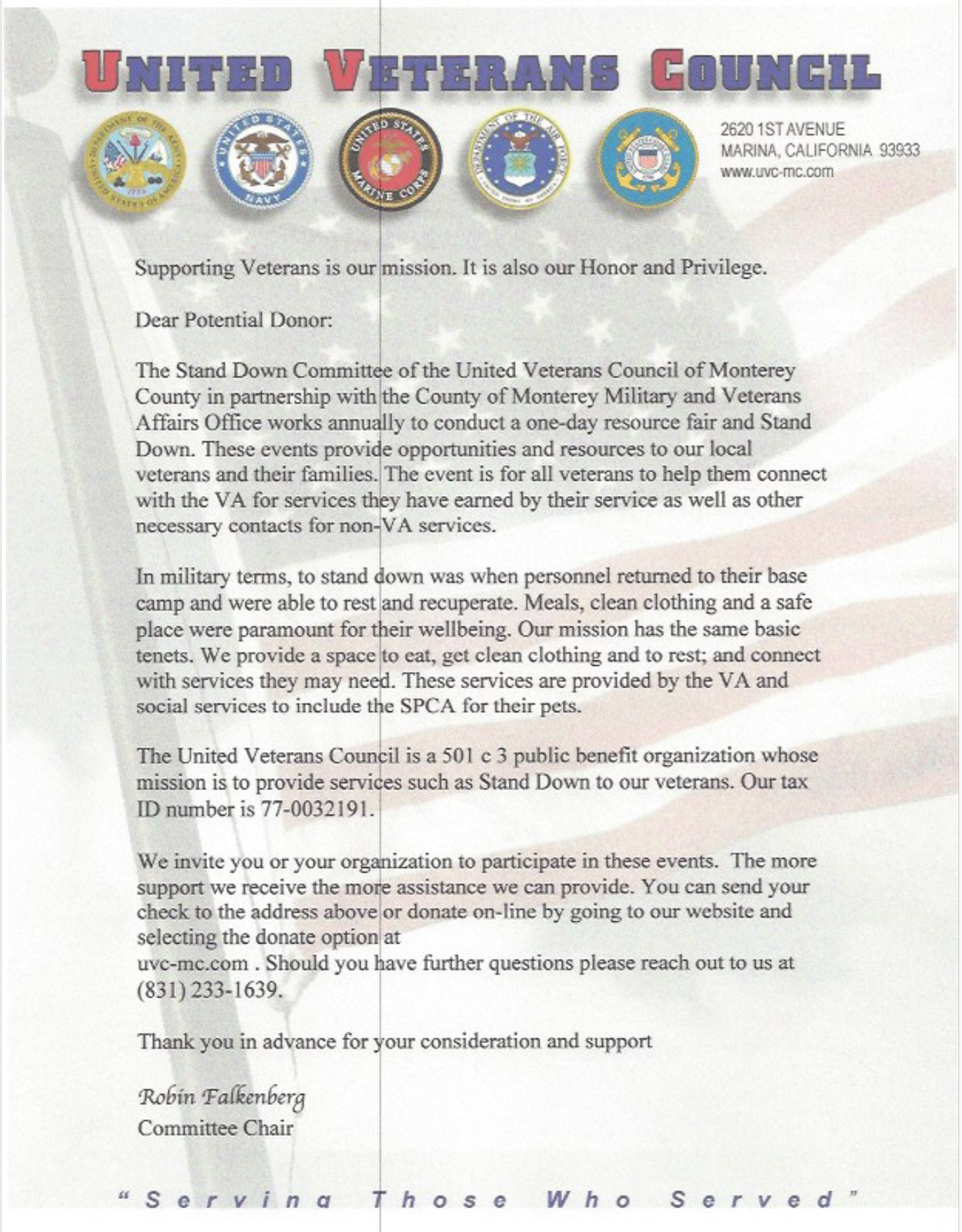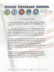 The United Veterans Council of Monterey County was established on 24 October 1983 to promote the common good and welfare of all veterans, their dependents, widows, orphans, and citizens of the United States. The UVC was officially re-incorporated as a 501(c)3 by the IRS in 2024.
